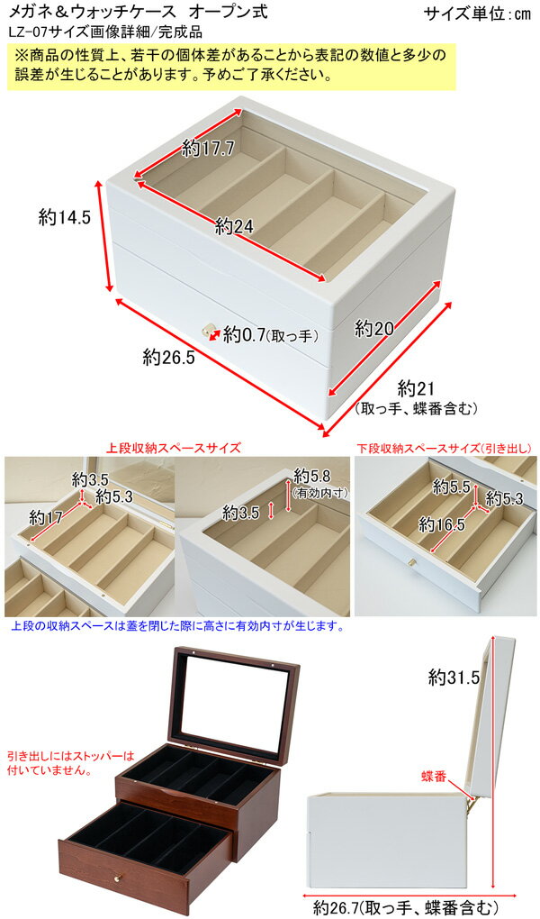 商品名 メガネ&ウォッチケース オープン式 仕様 サイズ:W265xD210xH145mm (梱包サイズ:W310xD260xH195mm) 本体重量:2kg(梱包重量:3kg) 完成品(1梱包) 素材:天然木化粧繊維板(ラッカー塗装) ガラス 生産地:台湾 ※商品の性質上、若干の個体差があることから、表記の数値と多少の誤差が生じることがあります。