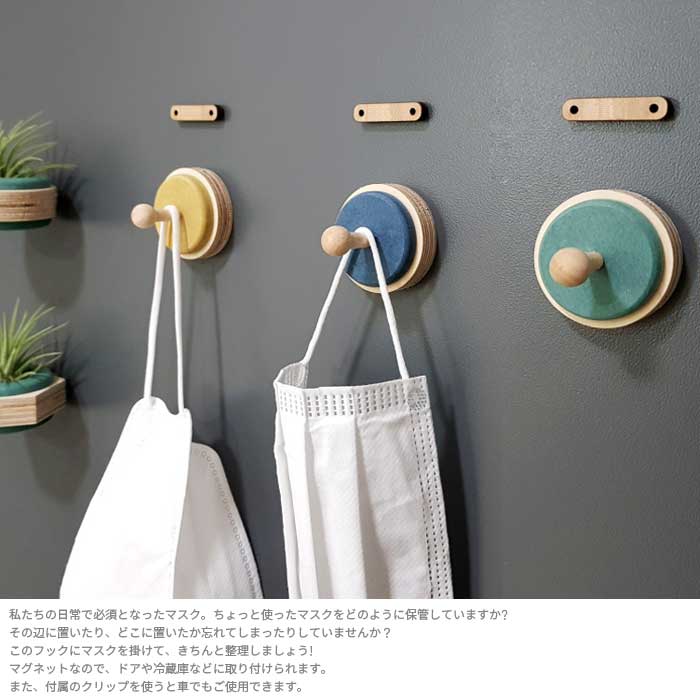 木製マグネットフック(マスク用フック) 素材:樺/エコボード/マグネット サイズ:直径40mm カラー:オレンジ/イエロー/グリーン/グレー/ブルー 同梱品:マグネットフック/車取り付け用クリップ /両面テープ 製造国:韓国 ※マスクは付属しません。