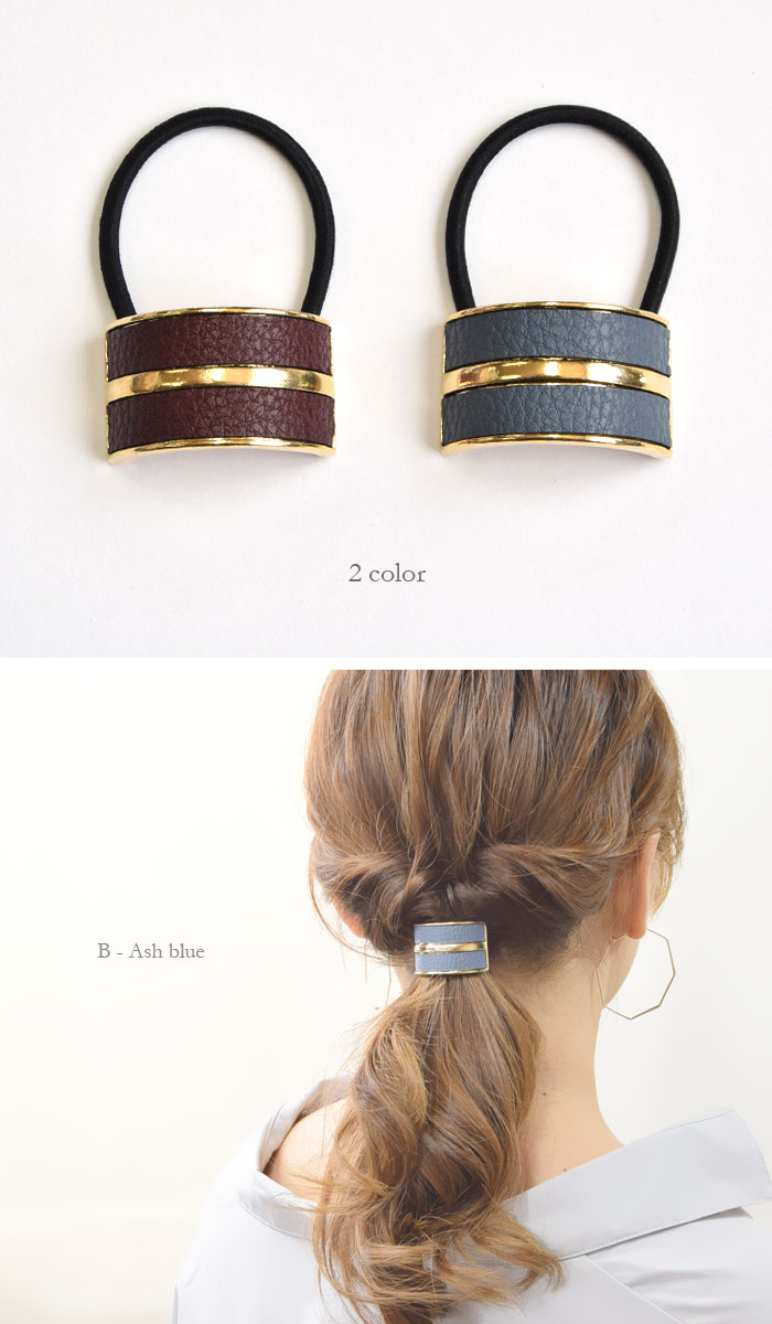 ダークなカラーのレザー風生地とゴールドカラーがおしゃれなデザイン! サイズ 約2.9×4cm ゴム:約14cm デザイン A(レッドブラウン)・B(アッシュブルー) 入数 1個入り 材質 合金・ポリエステル・ゴム 原産国 韓国 知っておいて頂きたいこと ▼平らな面に置いて測定しておりますので、実際に着用されるとサイズが異なる場合がございます。