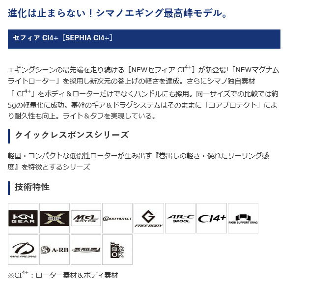 メーカー希望小売価格はメーカーサイトに基づいて掲載しています 20161225-02メーカー名 シマノ / SHIMANO 商品名 ◆2017年モデル セフィア CI4+ [SEPHIA CI4+] 商品情報 進化は止まらない!シマノエギング最高峰モデル。
