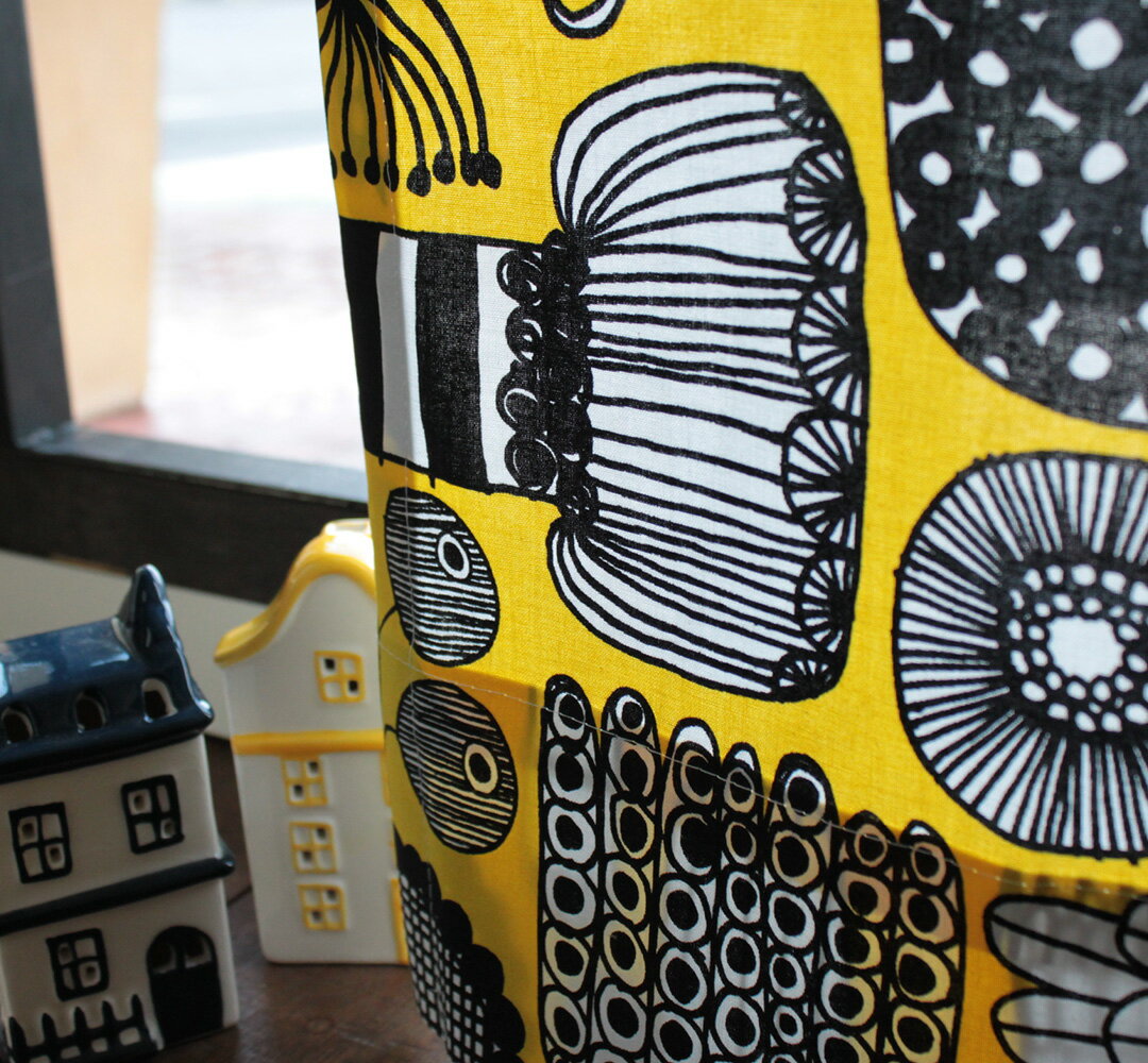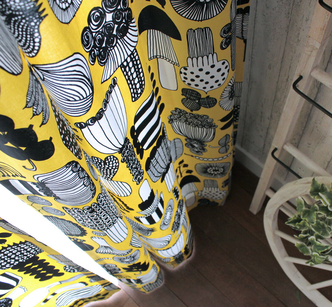 【北欧ブランドカーテン】プータルフリンパルハート(イエロー) Marimekko マリメッコ 「最高の庭師」を意味するプータルフリン パルハート 庭で育った草花や野菜がいっぱいでワクワクするデザインです。